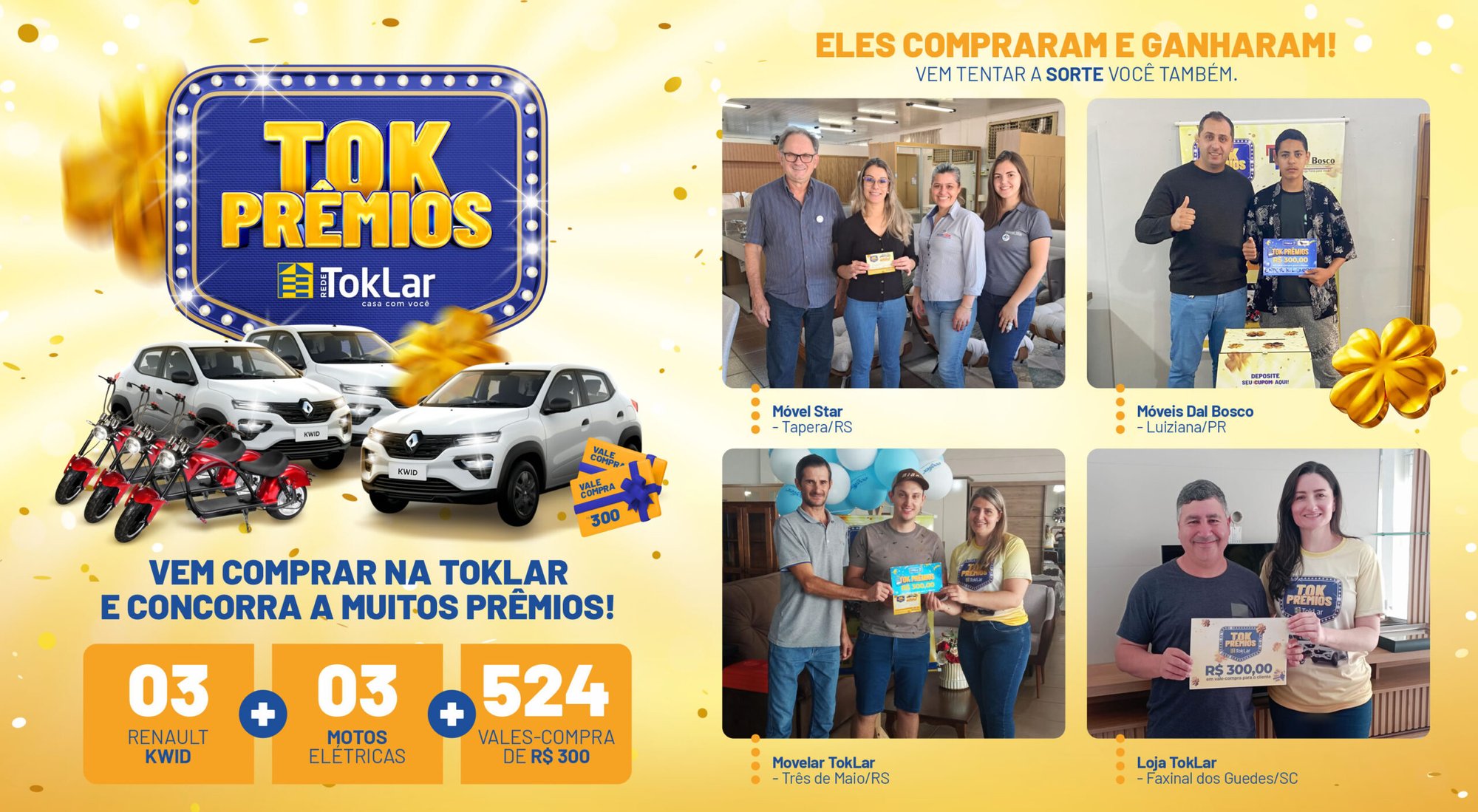 A campanha Tok Prêmios TokLar terá seu 4º sorteio no dia 21 de dezembro, com a premiação de 131 vales-compra nas lojas participantes do RS, SC e PR. No mês de maio a campanha teve seu lançamento e 131 lojas associadas TokLar são participantes da ação. Ao todo serão entregues 524 vales-compra de R$ 300 reais e no sorteio final 3 carros e motos zero km no dia 30 de janeiro. A cada R$ 200,00 em compras os clientes recebem cupom para concorrer as premiações, até o dia 31 de dezembro. Confira alguns dos clientes já contemplados!
